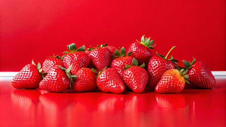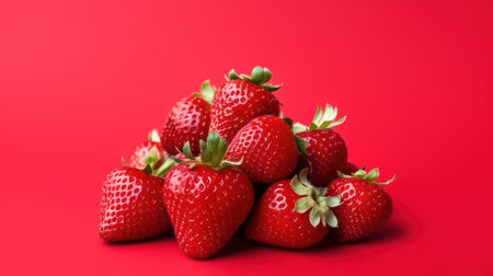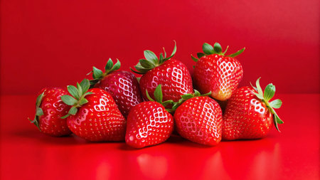 Fresh and luscious ripe strawberries, full of flavor, beautifully isolated on a vivid red background