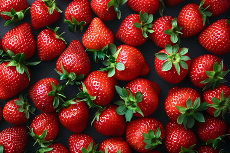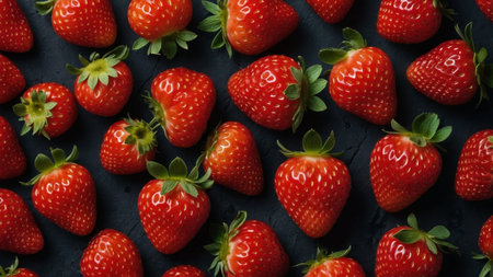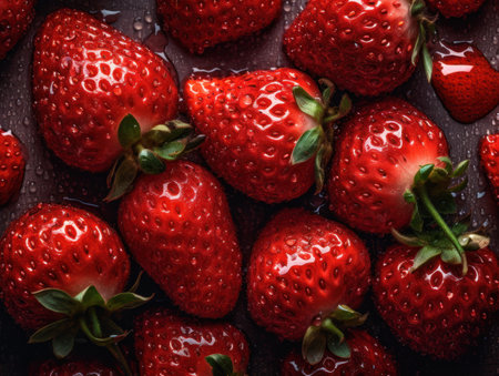 Fresh, ripe strawberries are scattered on a dark surface, showcasing their vibrant red color and green leaves. ideal for spring and summer-themed projects, culinary designs, and festive cards. Generative AI