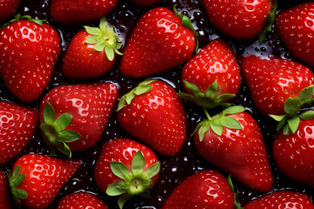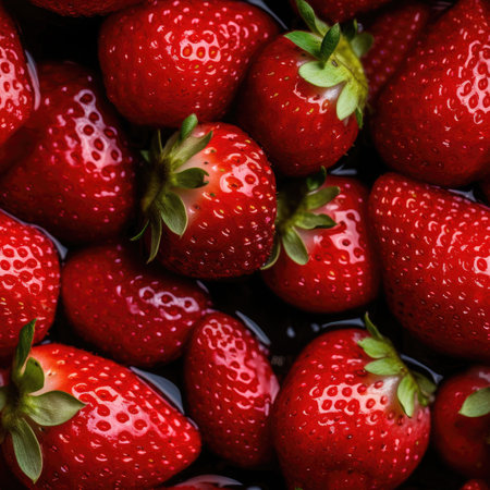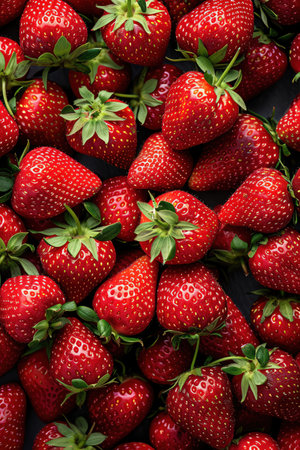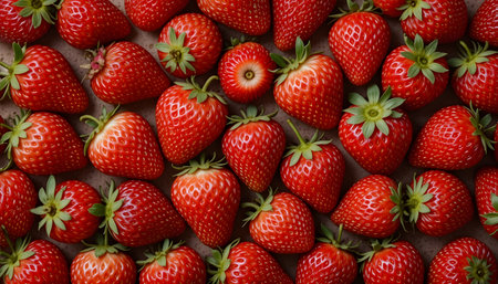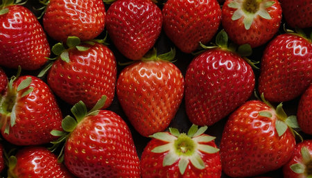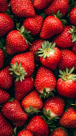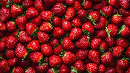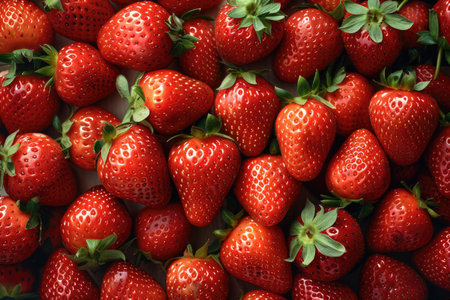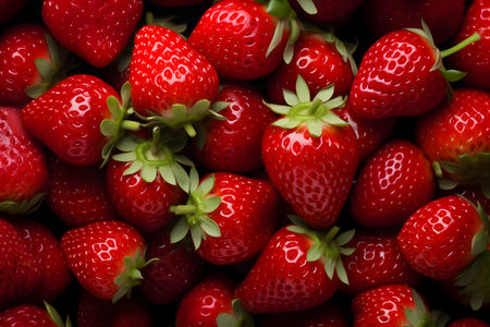 A full frame shot of a heap of ripe fresh strawberries, vibrant and juicy