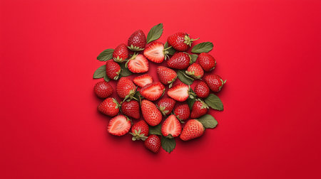 A vibrant arrangement of fresh strawberries with green leaves on a bright red background. This image captures the essence of freshness and is perfect for food-related themes. ai generated.