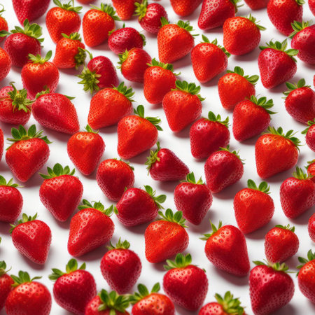 A stunning display of fresh strawberries arranged on a smooth surface, showcasing their vibrant color and casting interesting shadows ideal for culinary projects.