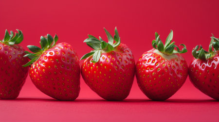 A close-up of fresh ripe strawberries arranged in a row against a bold and vibrant red background.