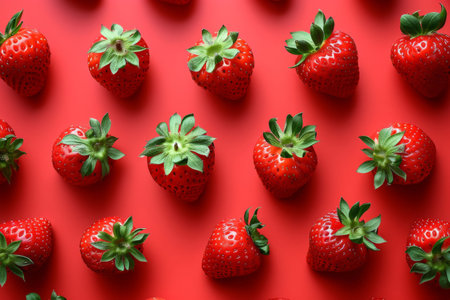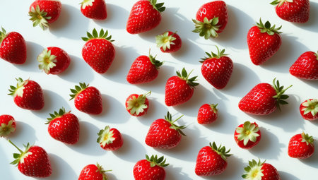 A beautiful flat lay of fresh red strawberries arranged in an eye-catching pattern on a light background. Ideal for food photography, culinary designs, and healthy eating themes.