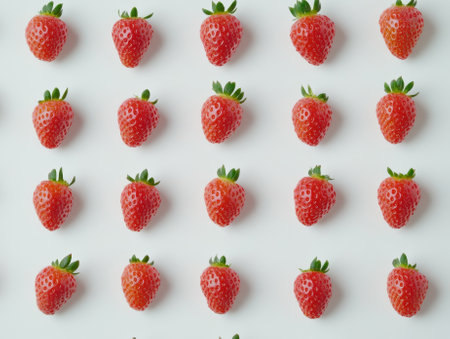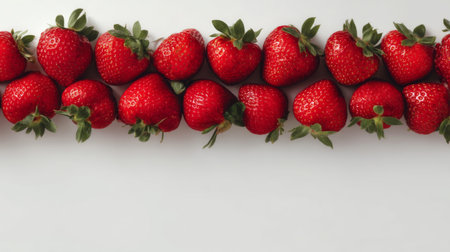 Vibrant red strawberries sit neatly in a row, showcasing their fresh appearance against a minimalist white background. Ideal for food photography and healthy eating themes.