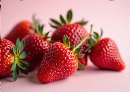 A visually appealing arrangement of fresh strawberries on a soft pink background. Ideal for themes related to health, nutrition, summer, and culinary delights.