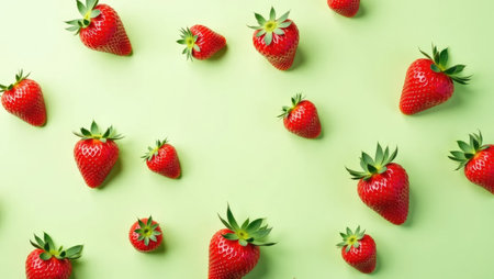 Overhead view of bright red strawberries artistically arranged on a soft pastel background, creating a cheerful and fresh image.