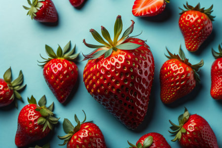 Sweet, plump strawberries presented on a refreshing blue background, hinting at the cool, juicy satisfaction they offer