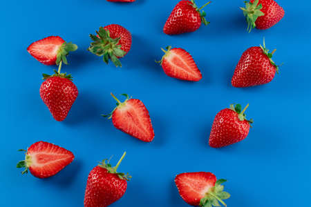 Strawberry slices and whole strawberries on blue background. Seasonal berry