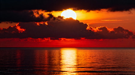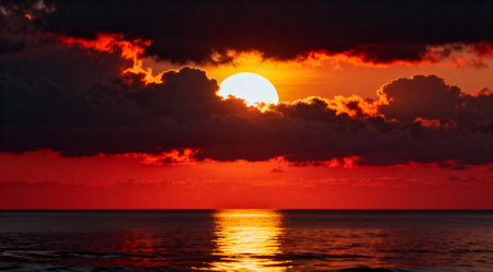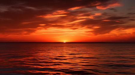 The horizon glows with a stunning display of reds and oranges as the sun sets, casting colorful reflections on the tranquil water. Wisps of clouds enhance the dramatic sky, creating a captivating moment of natural beauty. Generative AI