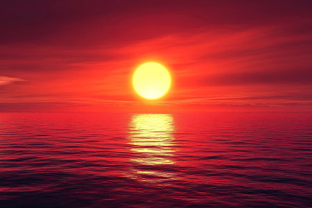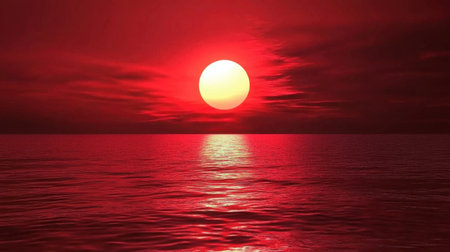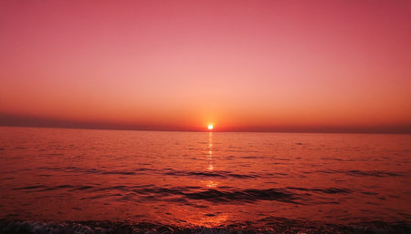 Experience the captivating beauty of a red sunset illuminating the calm ocean, where the serene waters reflect the vivid sky, creating an enchanting coastal scene.