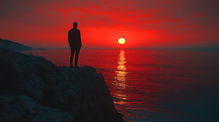 Generative AI Image of Silhouette of Man Standing in Cliff Edge on the Beach with Red Sky at Sunset
