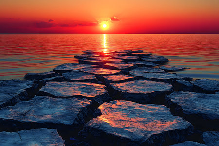 A breathtaking sunset casts vibrant hues across a calm ocean, reflecting warm colors on a unique cracked rock pathway leading into the water. the tranquil scene evokes feelings of peace and endless possibilities. Generative AI