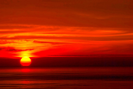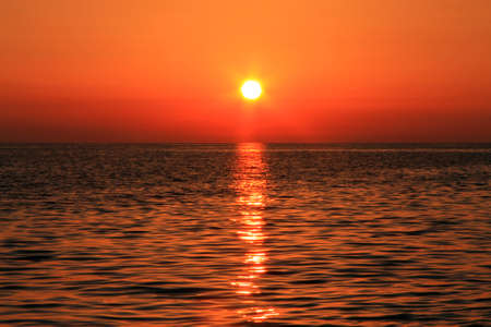 Beautiful sunset over sea in red and yellow colors, cloudy sky.
