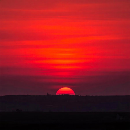 A red sunset over the ocean, with a large sun in the center of the frame. The sky is a deep crimson and orange, reflecting on the calm waters. There's an air of tranquility, as if you were looking at it from another planet. This scene would make a great background for a fantasy or sci-fi setting. --ar 3:2 --v 6.1 Job ID: c852c665-5cc3-4e8e-a098-2141b4bf8e59