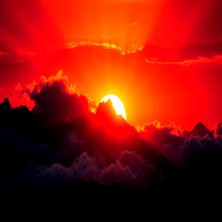 A vibrant sunset sky filled with dramatic red, orange, and purple clouds, glowing brightly at the horizon.