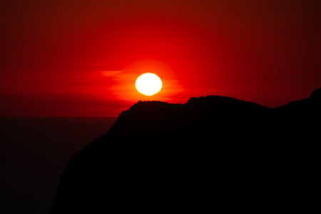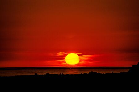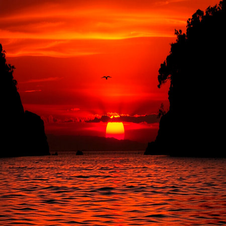 The sun sets over the sea, painting the sky with vibrant shades of red and orange, creating a stunning visual display