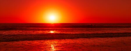 Setting sun over the Pacific ocean colors the sky and waves in red color.