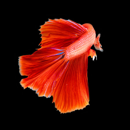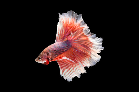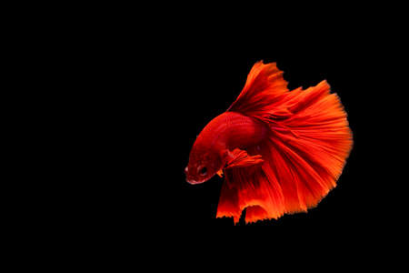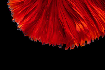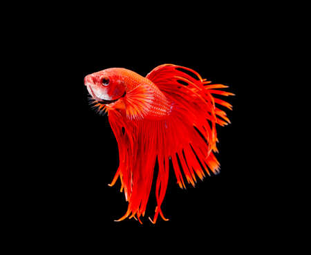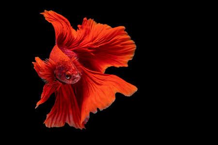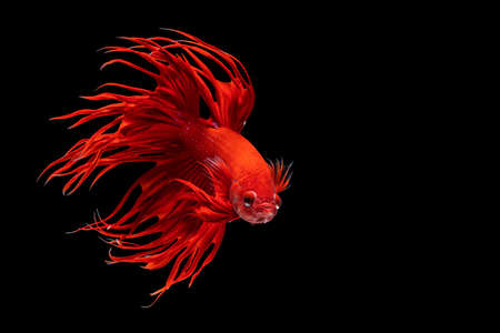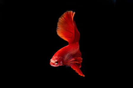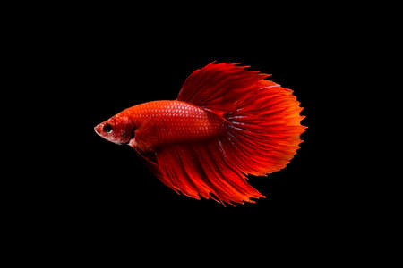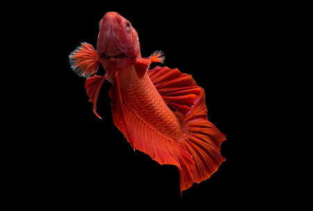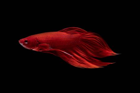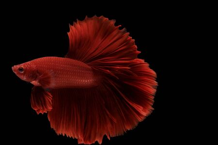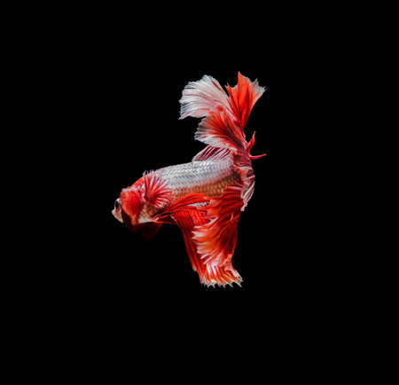 Moving moment of red Vailtail Siamese fighting fish or Betta splendens isolated on Black background