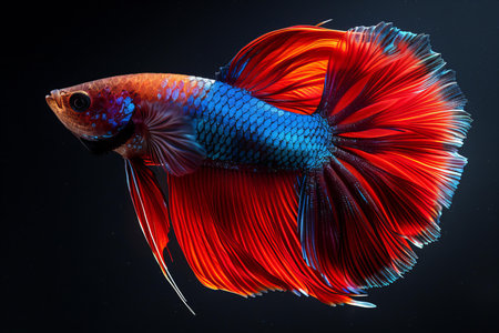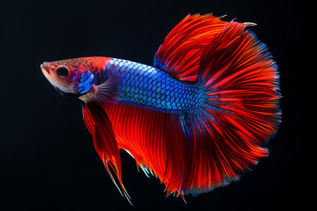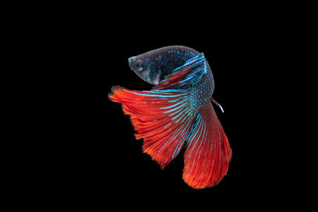 Capture the moving moment of red-blue siamese fighting fish isolated on black background. betta fish.