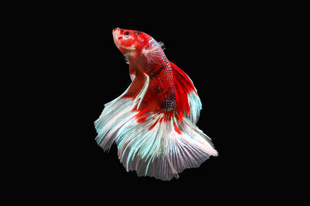 Halfmoon Betta splendens fighting fish in Thailand on isolated black background. The moving moment beautiful of red and white Siamese betta fish with copy space.