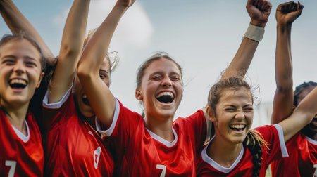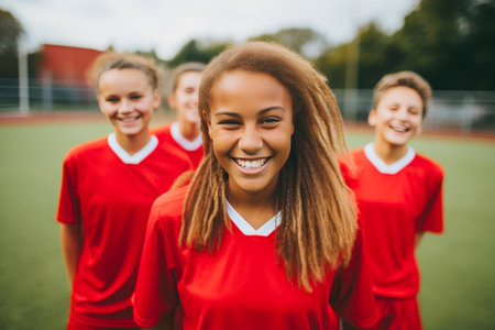 Cheerful High School Girls in Red Soccer Uniforms