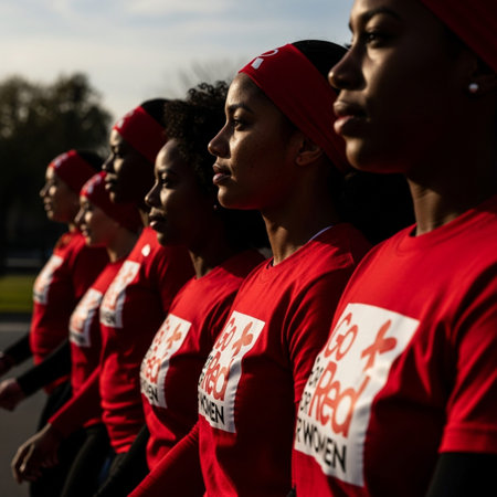 Editorial image capturing a diverse group of participants during a 'Go Red for Women' heart health a