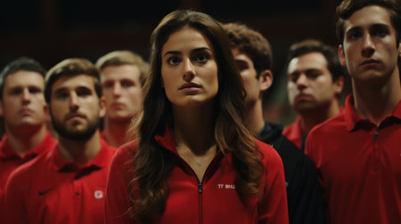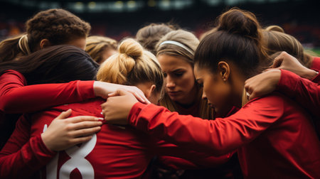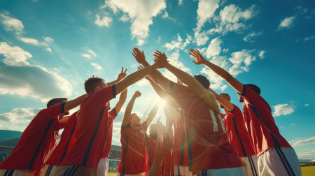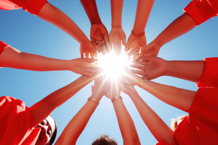 Teamwork and unity are celebrated in this of diverse group of athletes in red jerseys, joining hands in circle on grassy field, showcasing camaraderie and sportsmanship