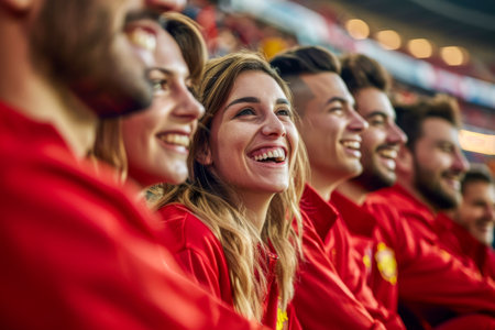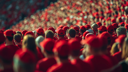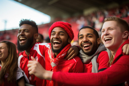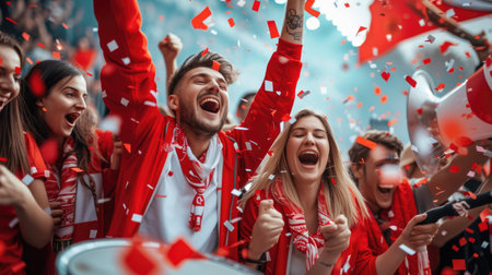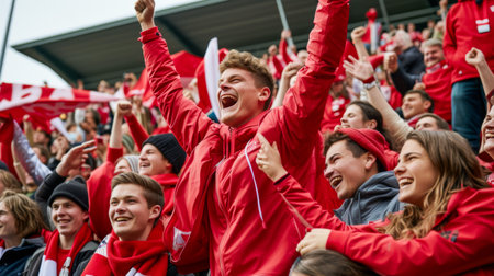 Enthusiastic fans in red clothing are cheering loudly at a sporting event, capturing the energy and excitement of the crowd in a lively and engaging atmosphere, AI generated
