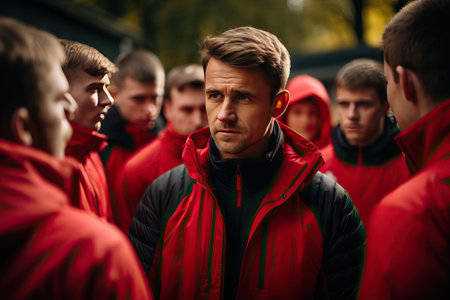 A sports coach with his players, a coach's recommendations before a training or game for his team.