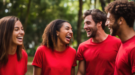 Young adults in red shirts are joyfully celebrating together, showcasing excitement and camaraderie in a vibrant atmosphere filled with energy and enthusiasm, AI generated