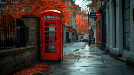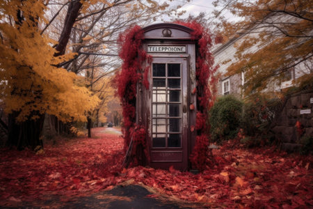 old telephone booth surrounded by autumn leaves, created with generative ai