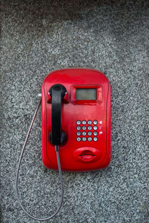 payphone close up. Phone with a red tube at a train station in Italy. Telecommunication concept.