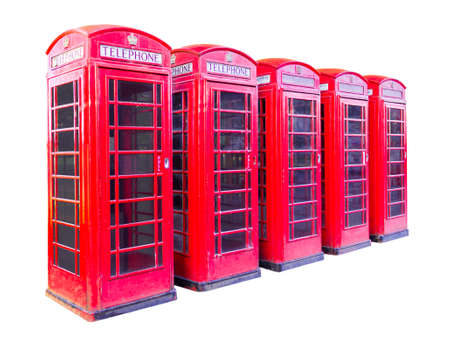 Five red telephone box in London isolated on white background
