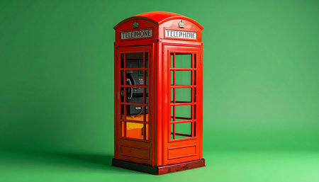A vibrant red telephone booth, a nostalgic icon of British communication, stands isolated against a stark, modern green background.