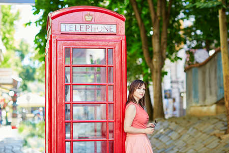 Girl makes a phone call inside a red telephone box