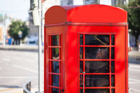 Classic British red phone booth on a city street. Traditional red british telephone box. historical architecture. Nobody, travel photo, selective focus
