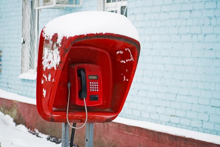 Telephone booth close-up. Red payphone on the street