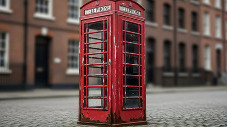 A classic red telephone booth stands on a grey cobblestone street with brick buildings in the blurred background. The iconic design contrasts with the urban setting, evoking a sense of travel, history, and British culture.