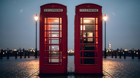 Two iconic red British telephone booths stand illuminated on a wet, cobblestone street at dusk. The warm glow of the booths contrasts with the cool, moody blue of the evening city backdrop.