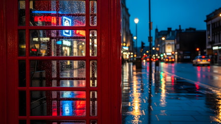 A classic red telephone booth stands on a wet city street at night, covered in raindrops. Blurred city lights and car taillights in the background create a moody, urban atmosphere.