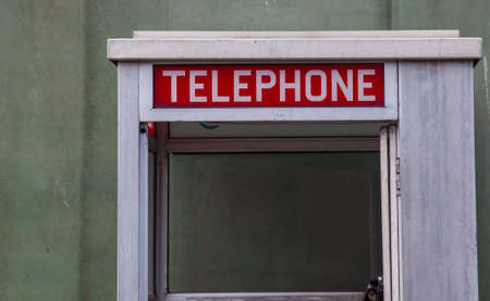 Telephone label on red phone booth
