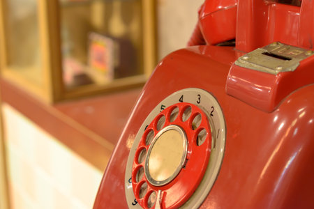 Close-up of a retro dial red payphone