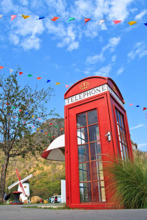 Red payphone in british style on mountain in Thailand.