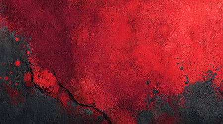 This abstract artwork features a vibrant red watercolor wash contrasting against a dark, textured background. Splatter and grunge effects contribute to a raw, artistic style. The composition suggests an open, undefined space suitable for creative design. This imagery is applicable for various commercial and editorial projects.
