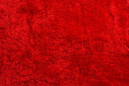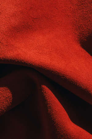 Red matte background of suede fabric, closeup. Velvet texture of seamless leather. Felt material macro. Red suede texture. Fabric, leather, material for designers.