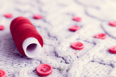 Beautiful texture of a soft warm natural sweater, fabrics with a knitted pattern of yarn and red small round buttons for sewing and a skein of red thread. The background.