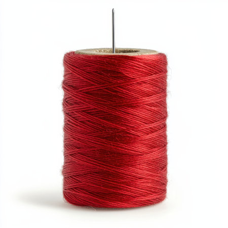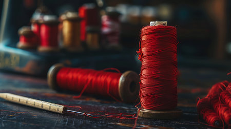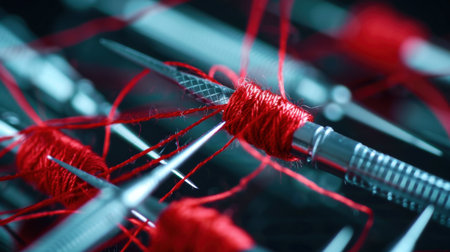This close-up image showcases precision sewing tools with vibrant red thread wrapped around metallic needles, perfect for emphasizing crafting and creativity.