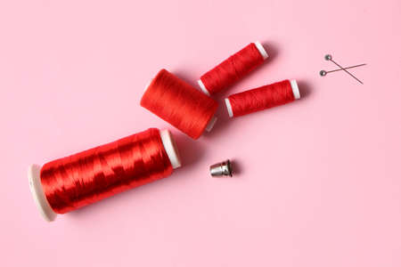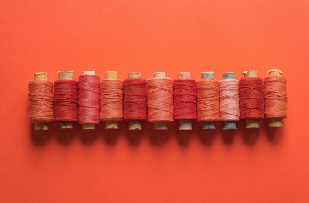 Spools of thread on red background, closeup