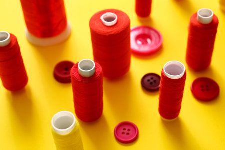 Thread spools and buttons on yellow background, closeup