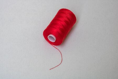 Red spool of sewing thread isolated, close up.